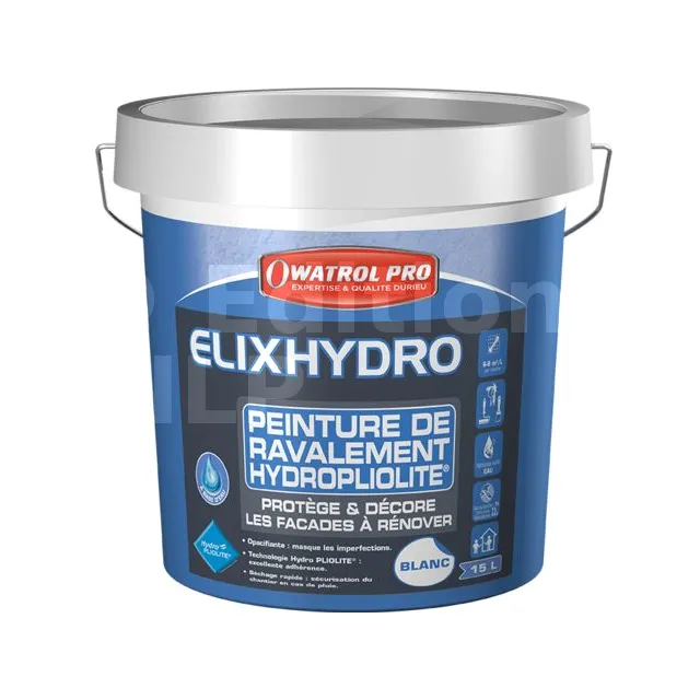 ELIXHYDRO est une peinture garnissante et opacifiante qui masque les imperfections sans reprise. Elle adhère parfaitement même sur les fonds farinants et/ou légèrement dégradés grâce à la Technologie Hydro PLIOLITE® ESB (emulsified binding system).