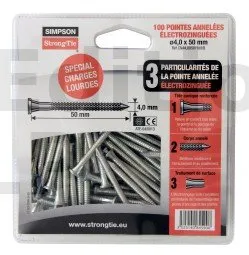 Les pointes annelées électrozinguées CNA sont préconisées pour les assemblages structurels des connecteurs Simpson Strong-Tie. Tous nos essais ont été réalisés avec ce type de pointes. Pour plus de traçabilité sur les chantiers, elles sont estampillées ≠, une garantie de qualité sans équivalent.