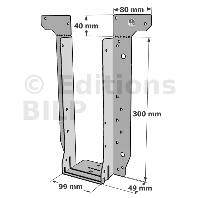 - Étrier fourni avec ses brides supérieures droites, pliables sur chantier afin de s’adapter à toutes les hauteurs de solives,
