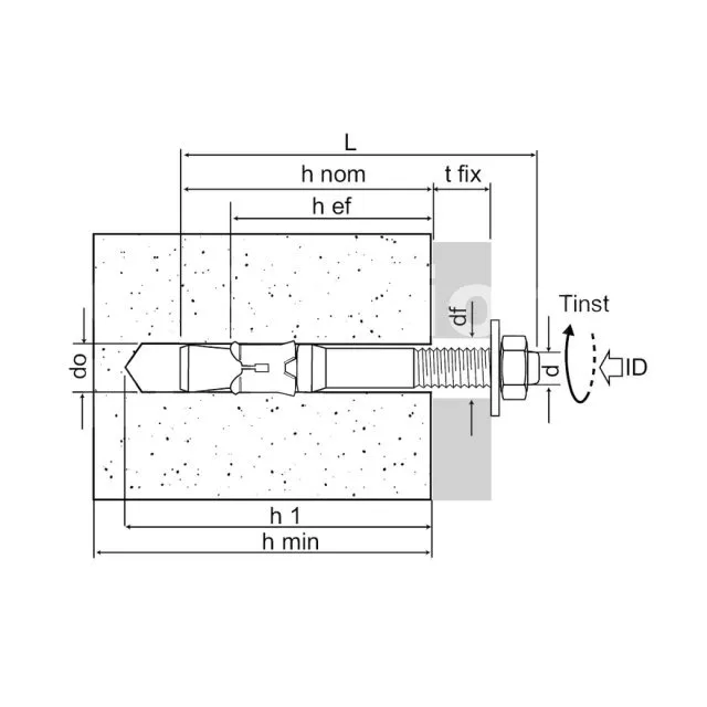 | Réference produit | Dimensions [ØxL] [mm] | Ø perçage [d0] [mm] | Prof. min. de perçage [h1] [mm] | Ø perçage dans pce à fixer (au travers) [df] [mm] | Ouverture de clé sur plat [SW] [SW] [mm] | Couple de serrage [Tinst] [Nm] | Prof. ancrage [hef] [mm] | Ep. mini du support [hmin] [mm] | |