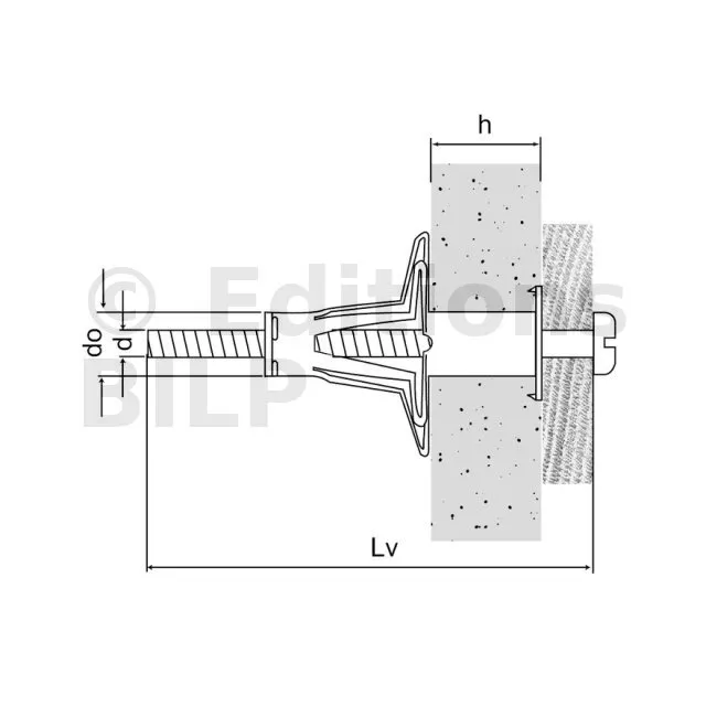 | Références | Référence | Dimensions vis [dxLv] [mm] | Ø perçage [d0] [mm] | Dimensions de la cheville [Ø x L] [mm] | Epaisseur mini paroi support [hmin] [mm] | Epaissseur maxi paroi [hmax] [mm] |