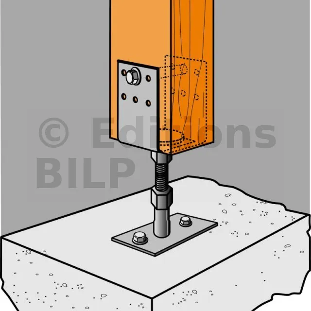 ** Référez-vous à la gamme d’ancrage Simpson Strong-Tie pour sélectionner l’ancrage adapté. Les solutions standards sont BOAXII, SET-XP, WA, AT-HP, à choisir en fonction du type de béton, de l’entraxe et des distances aux bords.