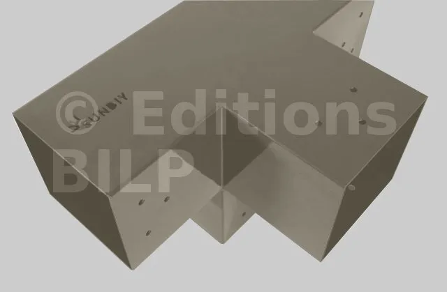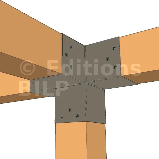 Il permet de raccorder une poutre de 90x90mm perpendiculairement à un chevron de 90x90mm, le tout étant supporté par un poteau vertical de 90x90mm.