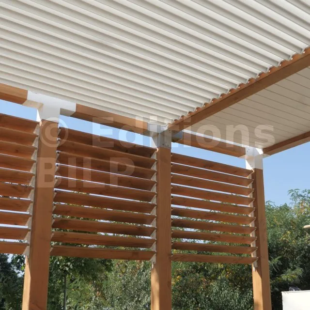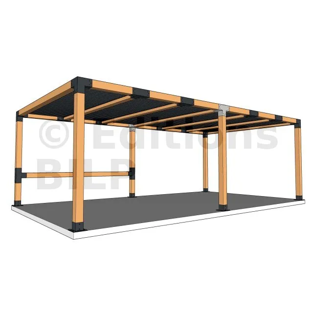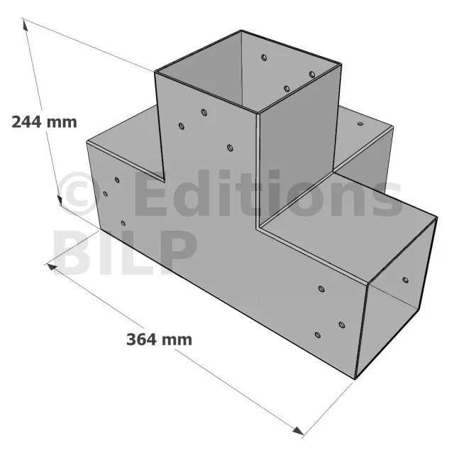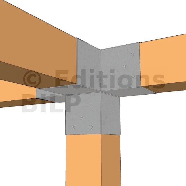 Il permet de raccorder une poutre de 120x120mm perpendiculairement à un chevron de 120x120mm, le tout étant supporté par un poteau vertical de 120x120mm.