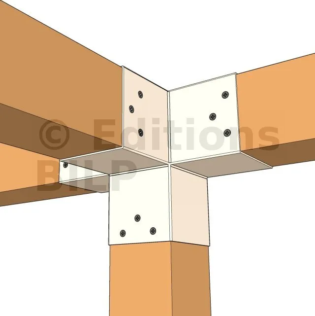Il permet de raccorder une poutre de 90x90mm perpendiculairement à un chevron de 90x90mm, le tout étant supporté par un poteau vertical de 90x90mm.