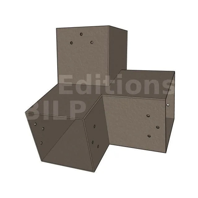 Il est utilisé dans un angle extérieur. Ce connecteur va permettre de raccorder une poutre 120x120mm à une poutre 120x120mm avec une pente de 20°, le tout étant supporté par un poteau vertical 120x120mm.