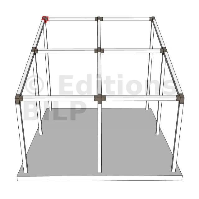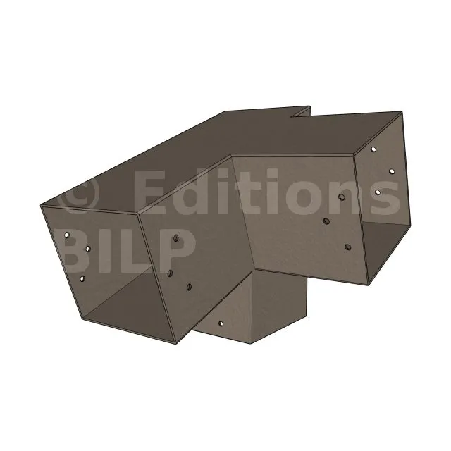 Il est utilisé dans un angle extérieur. Ce connecteur va permettre de raccorder une poutre 120x120mm à une poutre 120x120mm avec une pente de 20°, le tout étant supporté par un poteau vertical 120x120mm.