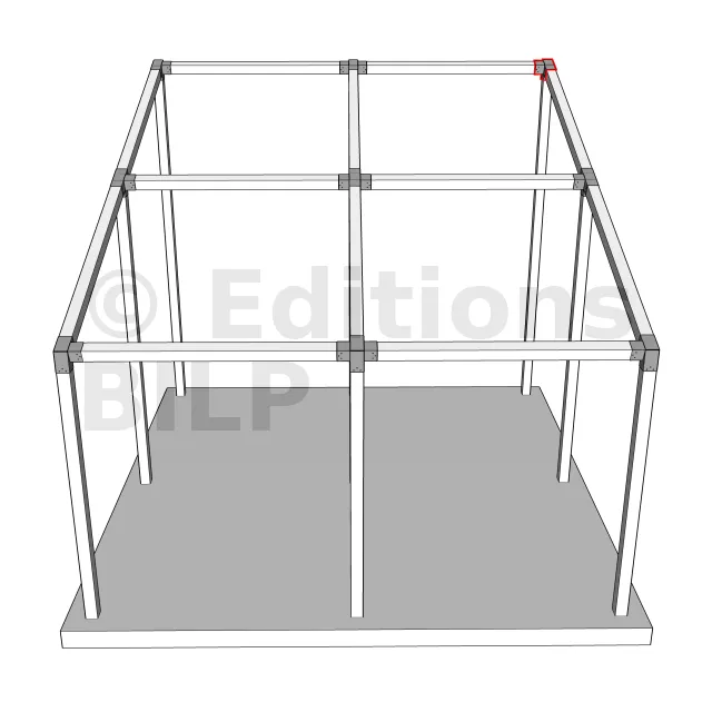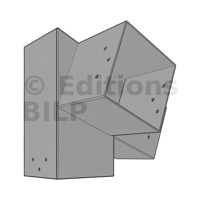 Il est utilisé dans un angle extérieur. Ce connecteur va permettre de raccorder une poutre 120x120mm à une poutre 120x120mm avec une pente de 20°, le tout étant supporté par un poteau vertical 120x120mm.