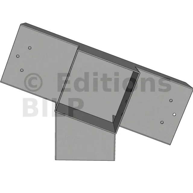 Connecteur d’angle intérieur à quatre directions, conçu pour l’assemblage de deux poutres en section 120x120 mm formant un angle de 20° avec un poteau vertical de même section. Il assure une liaison structurelle rigide et orthogonale à mi-hauteur, garantissant la stabilité de l’ensemble.