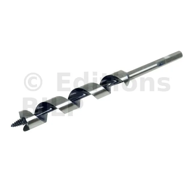 Mèche hélicoïdale en acier carbone trempé et rectifié avec précision, queue 6 pans. Pointe de centrage filetée exerçant une traction dans le bois, et ébaucheur unique amorçant la pénétration dans le bois pour le tranchant, pour des perçages plus précis.