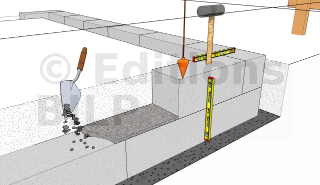 On étale une couche de 2cm de mortier à la truelle. Puis dessus on pose délicatement le bloc. On tapote avec le manche de la massette pour positionner le bloc. On vérifie au fur-et-à-mesure, la planéité avec le niveau à bulle, et l’alignement sur la ligne repère. La règle de maçon permet de vérifier l’alignement de plusieurs blocs. Avec la truelle, supprimez les reliquats de mortier sur les bords.