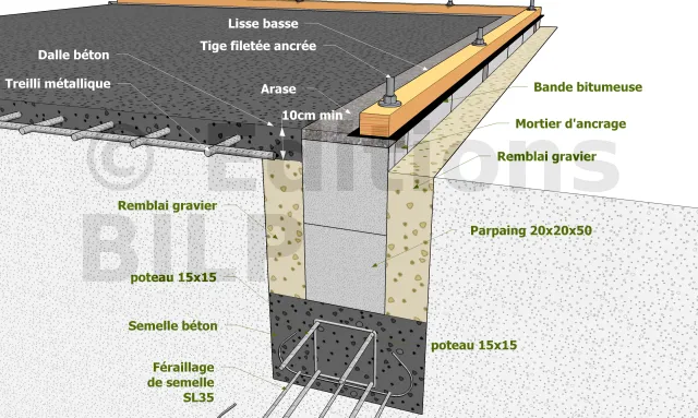 Il faut prévoir l’emplacement des fixations (équerres pour une plateforme, tiges filetées pour une lisse basse). Car il est impossible de fixer efficacement par le dessus d’un parpaing creux. Il faut du plein. Dans le cas d’une tige filetée, vous remplissez avec un mortier relativement "sec" qui autorise un scellage immédiat de la tige. Un plan de disposition des fixations est nécessaire pour ne rien oublier et pour ne pas tomber sur un montant vertical (mur sans plateforme).