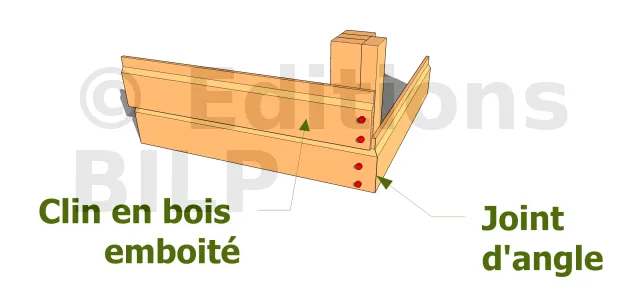 Pour les clins en bois emboîtés, la fixation des extrémités se fait au niveau des joints d’angles. Bien emboîter les pièces entre elles et assurez-vous qu’il n’y ait aucun espace entre les pièces. Les clous doivent être placés sur les extrémités. Bien former les joints d’angles à la scie à onglet.