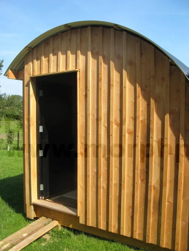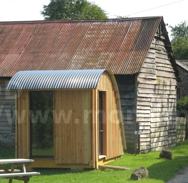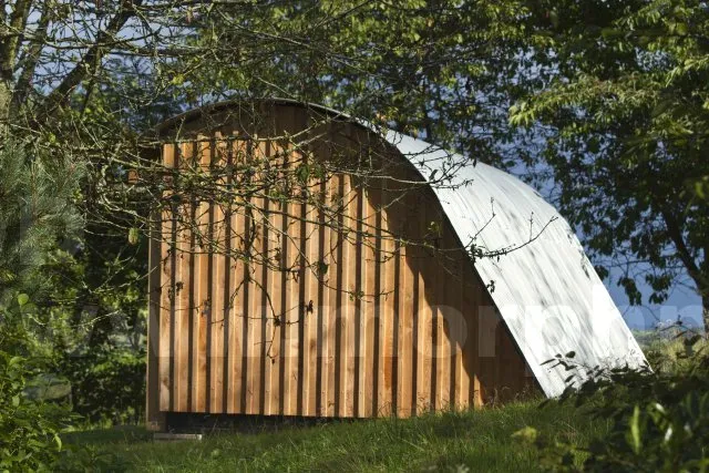 Bardage et toit arrondi imitant le style environnant.