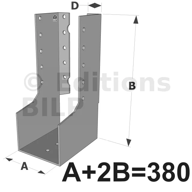 ATTENTION, pour les sabots SAI-SAIL à ailes intérieures de largeurs inférieures à 64 mm (SAI) et 80 mm (SAIL), les ailes sont recoupées sur la hauteur dans l’axe des perçages de boulons. La fixation sur le porteur est donc uniquement possible par pointes ou vis dans la ligne verticale de perçages Ø5 proche du pli. Exemple : SAI200/42/2 ; SAIL340/50/2