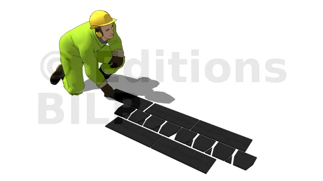 Pour chaque bardeau à couper, et à partir de la surface arrière supérieure, couper les bardeaux au niveau des lignes d’onglet. Coupez les coins supérieurs de chaque carré avec une coupe en biais, en commençant juste en dessous de la bande d’étanchéité pour éviter les chevauchements dans la zone de révélation.