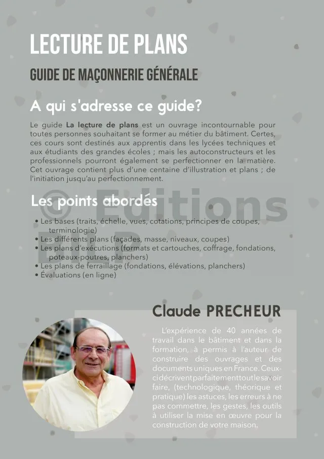 L’expérience de 40 années de travail dans le bâtiment et dans la formation, a permis à l’auteur de construire des ouvrages et des documents uniques en France. Ceux-ci décrivent parfaitement tout le savoir faire, les astuces, les erreurs à ne pas commettre, les gestes, les outils à utiliser et la mise en œuvre pour la construction de votre maison. Que ce soit la construction principale, les annexes, les extensions, la rénovation ou les simples travaux d’extérieur. Le tout pédagogiquement afin que chacun d’entre nous puisse comprendre et mettre en pratique les conseils fournis.