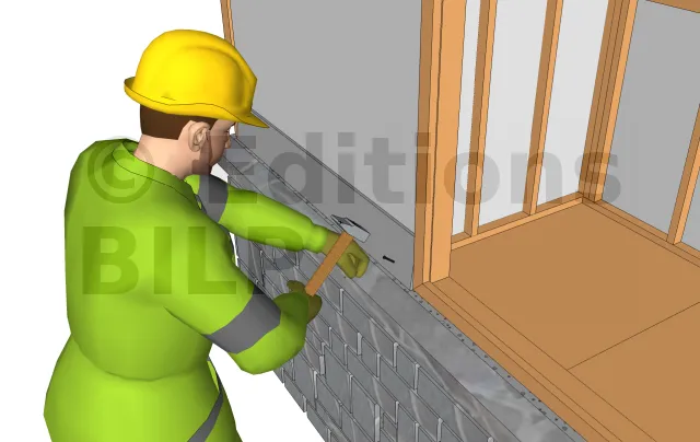 Découper la bande de démarrage de même épaisseur que les planches à installer. Placer-la le long de la partie inférieur des murs. Installez les bandes découpées à partir du bord , alignés sur les bords inférieurs du revêtement mural . Les premiers rangées du parement chevaucheront cette bande et servira de base pour les autres rangées à installer. Tracez des lignes de craies verticales pour marquer l’emplacement des poteaux muraux. Clouez par la suite les bandes de démarrage avec des clous galvanisés de types 6d suivant les lignes de craies.