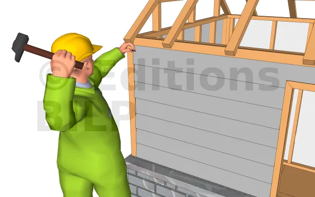 Sauf par le fait du hasard ou bien que vous avez bien calculé d’avance, la partie supérieure de la dernière rangée du parement doit être ajustée. Avec une scie circulaire et un guide règle, coupez le haut de la bande de sorte que les plans de coupe butte bien contre la frise. Clouer les planches coupées en place.