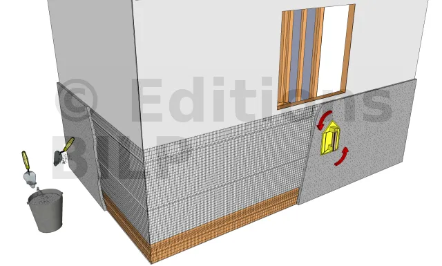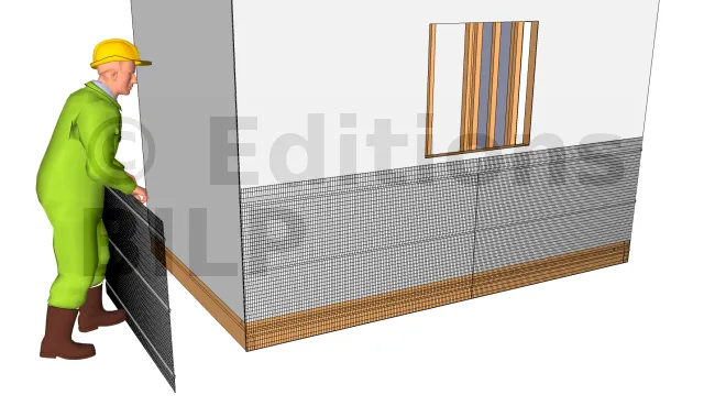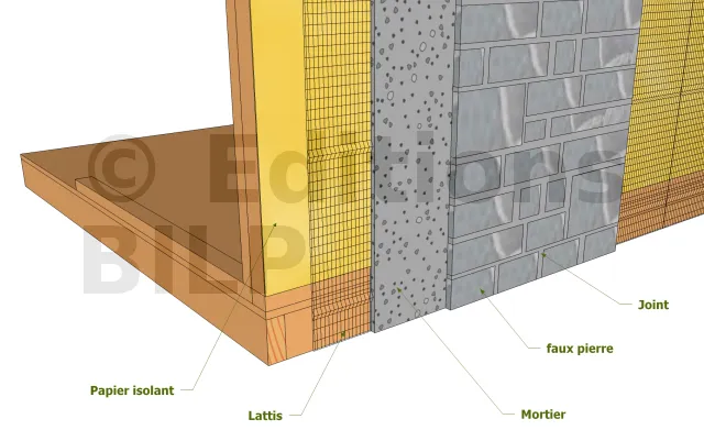 Les pierres de placage de fonte peuvent être appliquées sur un mur plein ou bien tout simplement orner les parties extérieures d’une parois. La hauteur de recouvrement est idéale entre 91 et 107 cm. Une couche de lattis est étalée et fixée sur le papier isolant pour servir de ferraillage au mortier