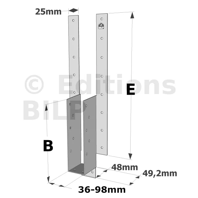 - Ailes pliées pour ajuster la hauteur du sabot par rapport à l’élément porteur. Clouer les ailes rabattues.