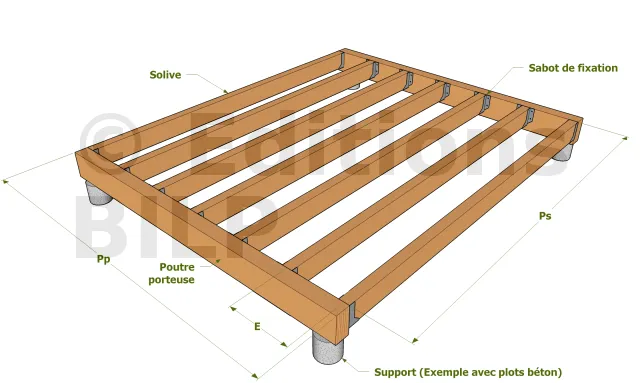 Les sabots métalliques sont les éléments de fixations les plus courants et les plus efficaces. Mais on peut aussi adopter une fixation par étrier qui a l’avantage d’être plus discrète que les sabots. Mais pour une plateforme de cabane, la dissimulation n’est pas une priorité.