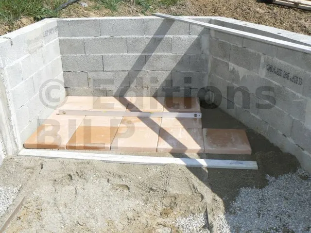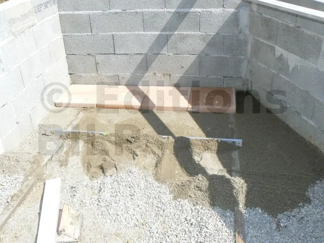 Pour niveler, on pose deux gros tasseaux de part et d’autre. On ajuste au niveau à bulle. On cale temporairement. On verse le sable entre les deux tasseaux, on tasse un peu, on rajoute du sable si nécessaire puis on nivelle avec la règle de maçon en s’appuyant sur les tasseaux.
