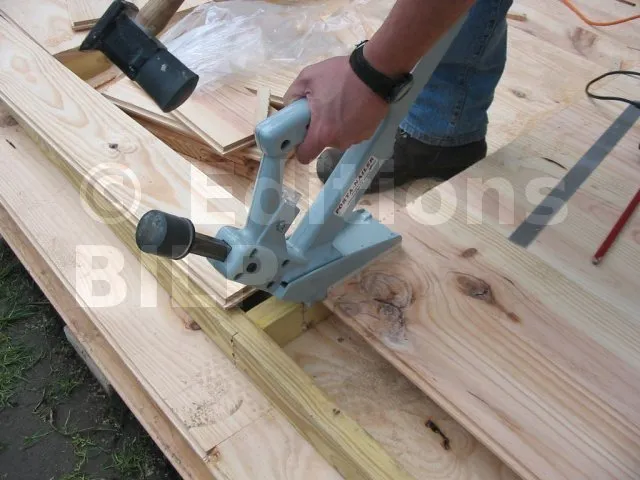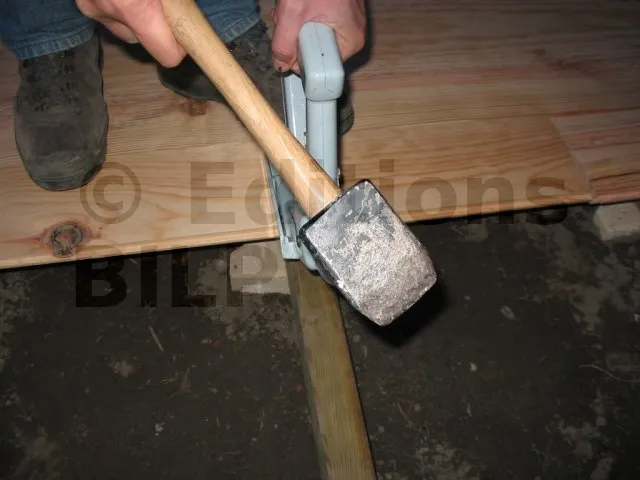 Pour clouer les lames sur les lambourdes, on a eu la chance de disposer d’un cloueur à parquet. C’est un outil fantastique, très efficace qui permet de travailler rapidement, avec précision et sécurité. Évidemment, on peut aussi faire avec un simple marteau ou avec des vis.
