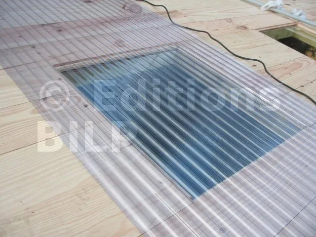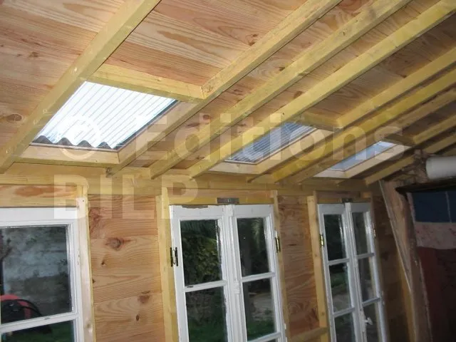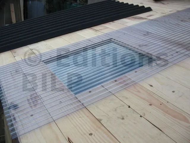 On a simplement pratiquer une ouverture dans la platelage de la toiture sur laquelle on a posé une plaque ondulée en PVC transparent. Idéalement, il faut choisir les plaques opaques et transparente avec le même profil d’onde. Cela n’est malheureusement pas le cas sur cet abri.