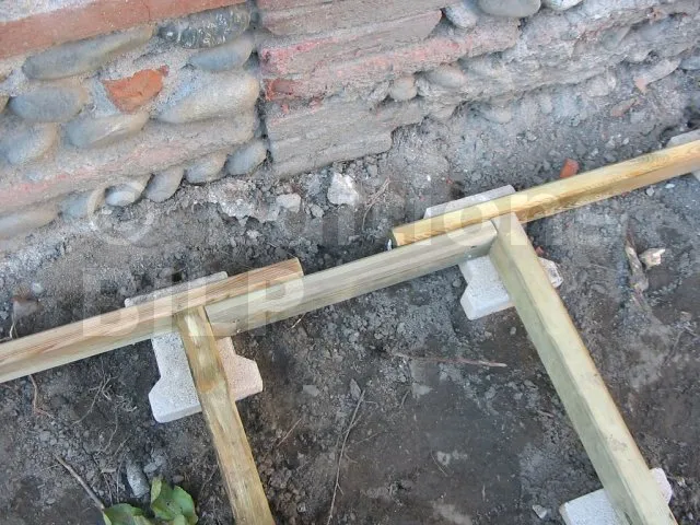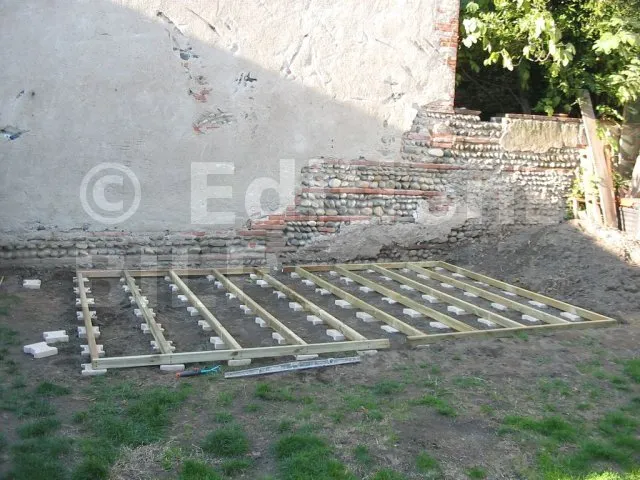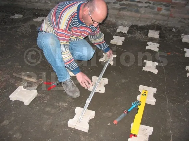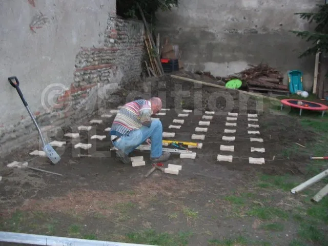 Les pavés sont posés et de niveau. On pose maintenant les lambourdes.