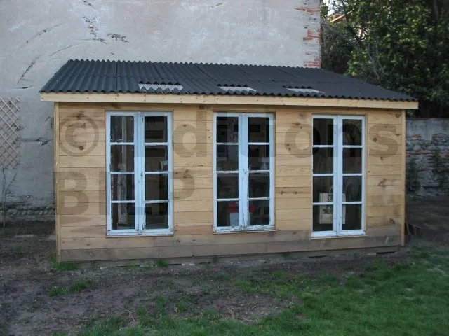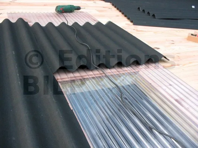 La toiture est réalisée avec de la tôle ondulée en résine, posée sur des solives.