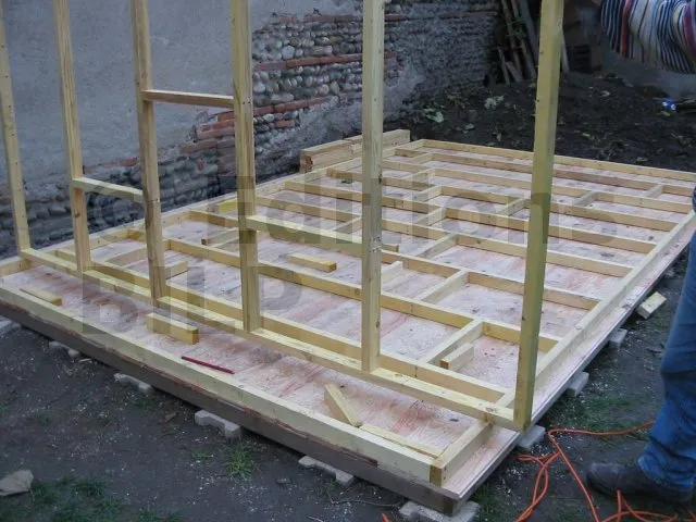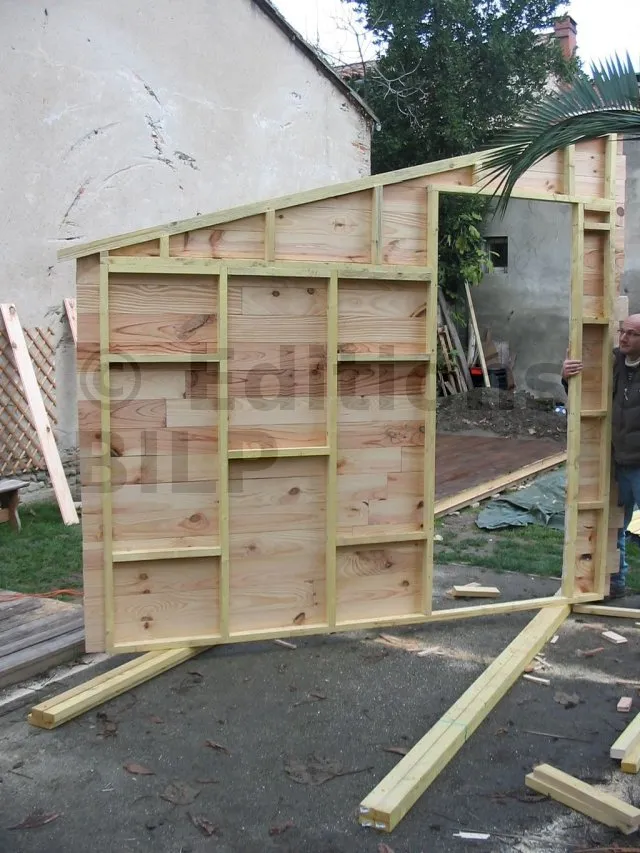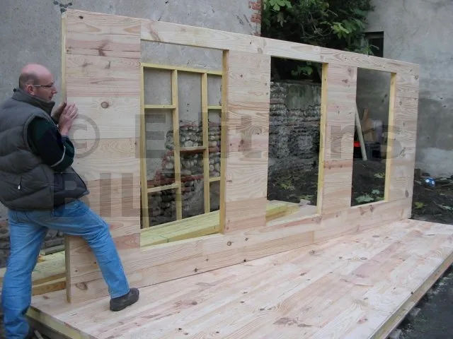 Il est plus rationnel de préparer les murs à plat, à l’horizontal au sol, puis de les monter en un seul bloc. On se sert du plancher déjà réalisé comme base horizontale pour préparer nos ossatures.
