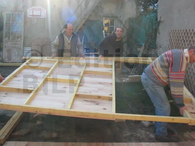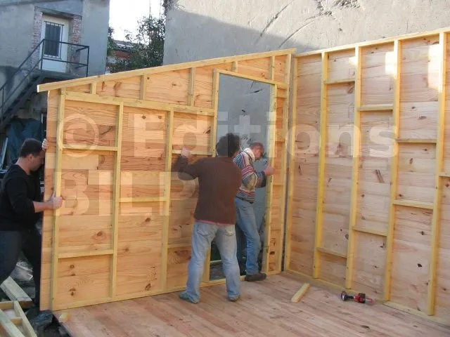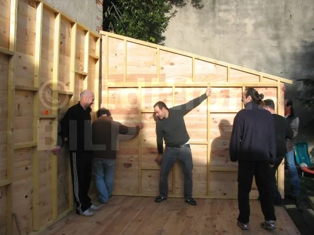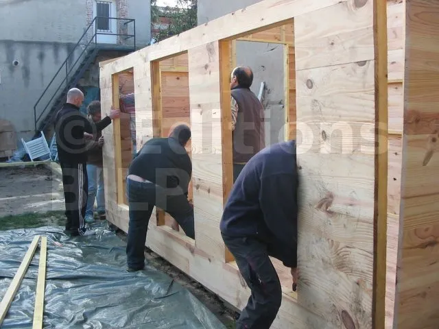 Toutes les parois sont terminées et en attente de montage. Il est temps de les apporter une à une sur la plat-forme et de les fixer. Pour cette étape, on a fait appel à des bons copains, car les parois sont lourdes. C’est pas le moment de se faire un lumbago !