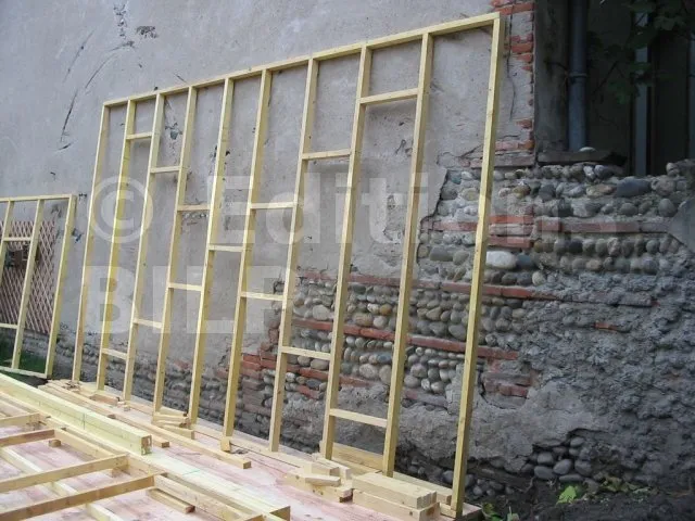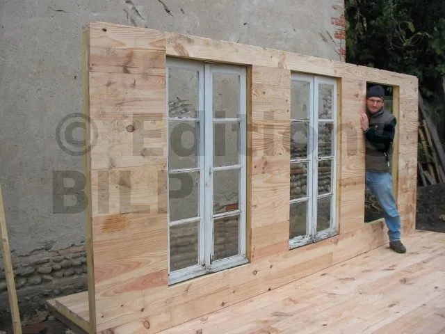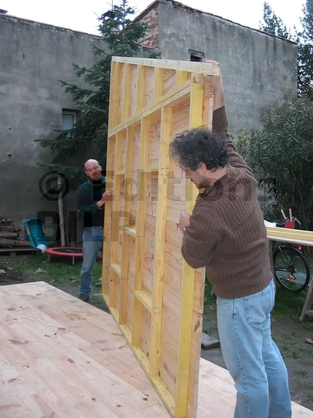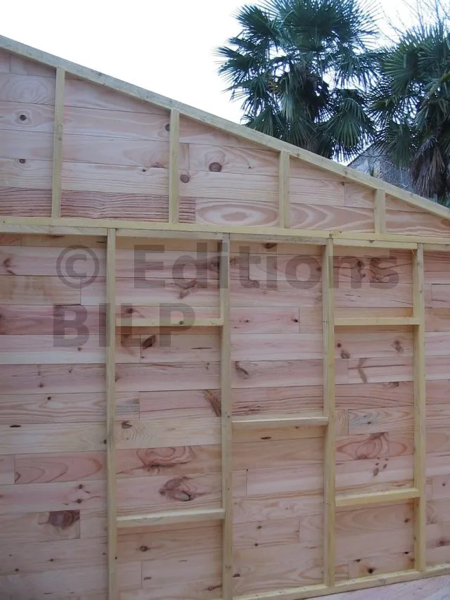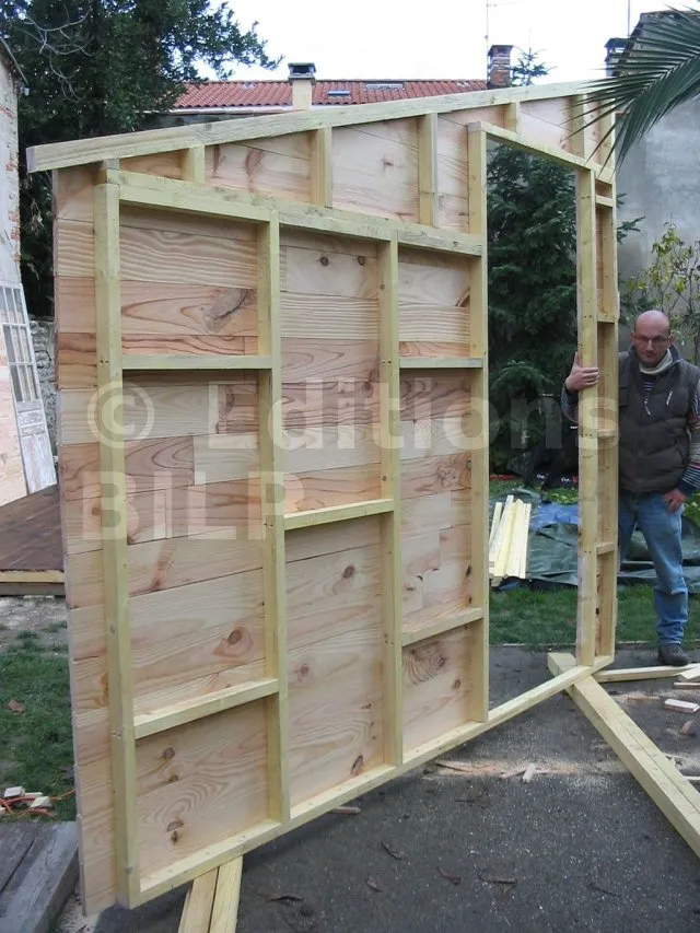 On commence par construire le squelette des murs. L’ossature est composée de montants verticaux espacés d’une cinquantaine de centimètres. On fixe des entretoises entre les montants pour fixer l’écart et pour assurer le contreventement. Une lisse haute et une lisse basse, faites des mêmes lambourdes que les montants, sont fixées aux extrémités.
