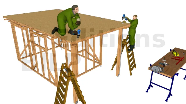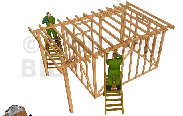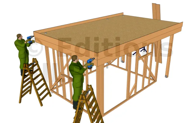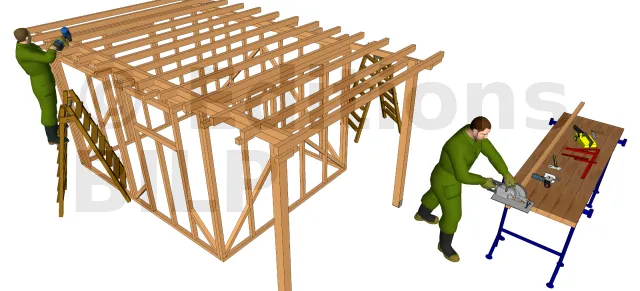 Pour les lisses : Découper à la bonne longueur les chevrons et fixer directement sur les lisses hautes de l’ossature. Après, comme la portée entre les deux façades principales est assez longue, poser une poutre à l’aide des mêmes vis et fixer de part et d’autre des chevrons et lisses hautes de l’ossature.