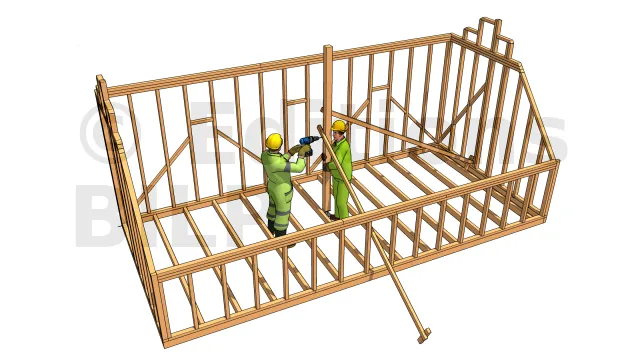 • Placer et fixer ensuite les ossatures des façades principales. Fixer les montants extérieurs de cette façade avec ceux des façades latérales, l’ossature de l’atelier est prêt !!