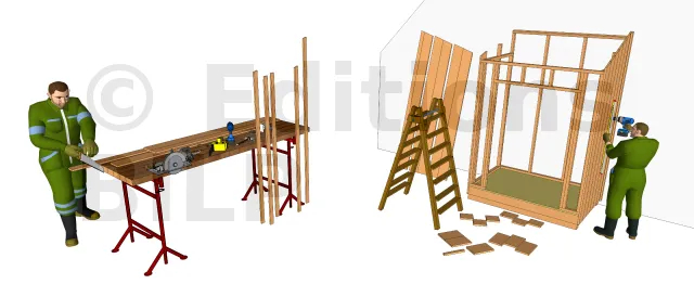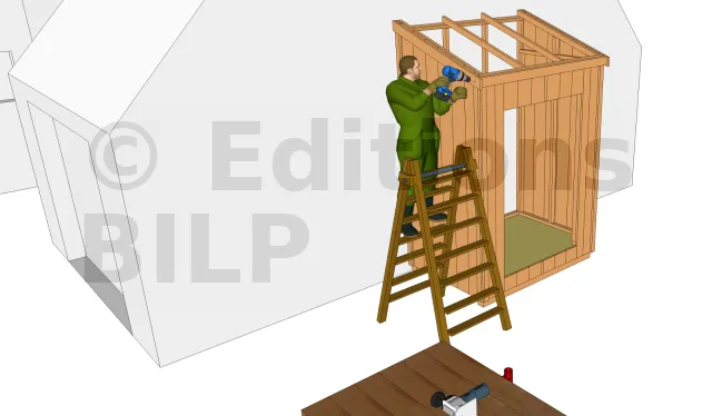Découpez à la bonne longueur ces chevrons inclinés, repérez sur les lisses hautes des murs de devant et de derrière les emplacements de ces chevrons et fixez-les ensuite avec des vis D6 L100. Pour bien réussir les coupes des angles, utilisez une scie à onglet. De même pour le chevron horizontal de devant.