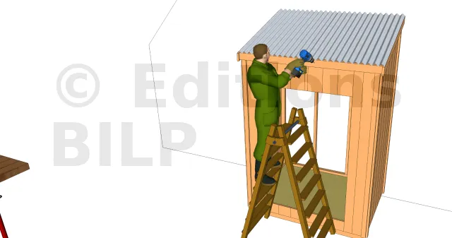 Les chevrons présentent un angle de 18° pour la toiture. Aidez-vous d’une scie à onglet pour les découpes. Fixez-les alors sur les lisses hautes des ossatures avec des vis. Pour les liteaux, découpez simplemet à la bonne longueur et fixer sur les chevrons avec les bons écartments.