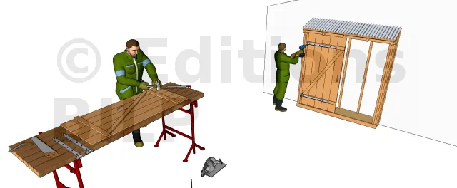 Découper chaque éléments selon les plans. Commencer par assembler un vantail avec les baguettes de haut et de bas, finissez par la baguette du milieu en oblique. A l’aide de vis, de niveau à bulle, poser chaque vantail en assurant sa verticalité, c’est essentiel. Faites des essais !!