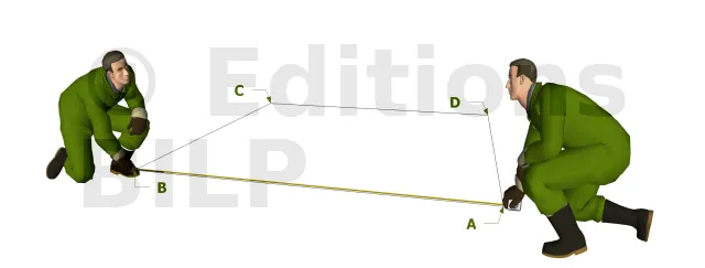 Ici, l’objectif est de repérer la surface de l’abri au sol. Nous procéderons par la méthode 3-4-5 pour l’implantation de la cabane. Le point de départ A (extrémité droite de la façade principale) sera connu. En partant de ce point, rapporter la première longueur de la lisse (3,40 m) en traçant une ligne droite à l’aide d’un cordon jusqu’au point B (extrémité gauche de la façade principale). Prendre ensuite le troisième coin (point D, extrémité gauche de la façade postérieure) en mesurant la diagonale ou l’hypoténuse du premier triangle (4.67 m) et la longueur du segment [AD]=3.20 m. Le quatrième point C (extrémité droite de la façade postérieure) s’obtient facilement en mesurant 3.40 m du point D et 3,20 m du point B. Là, vous avez les 4 coins extérieurs des lisses.