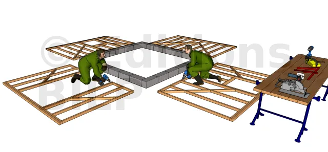 - Avant de poser les ossatures, appliquer une bande d’arase sur la fondation. Monter puis fixer les parois à l’aide des écrous et des tiges filetées contre les parpaings. Munir d’une équerre, d’un niveau à bulle et d’une main d’œuvre requis pour tenir le tout. Vérifier l’équerrage de la surface au sol après fixation des deux ossatures latérales. Les diagonales doivent être de même mesure. Pour cela, aidez-vous d’un décamètre.